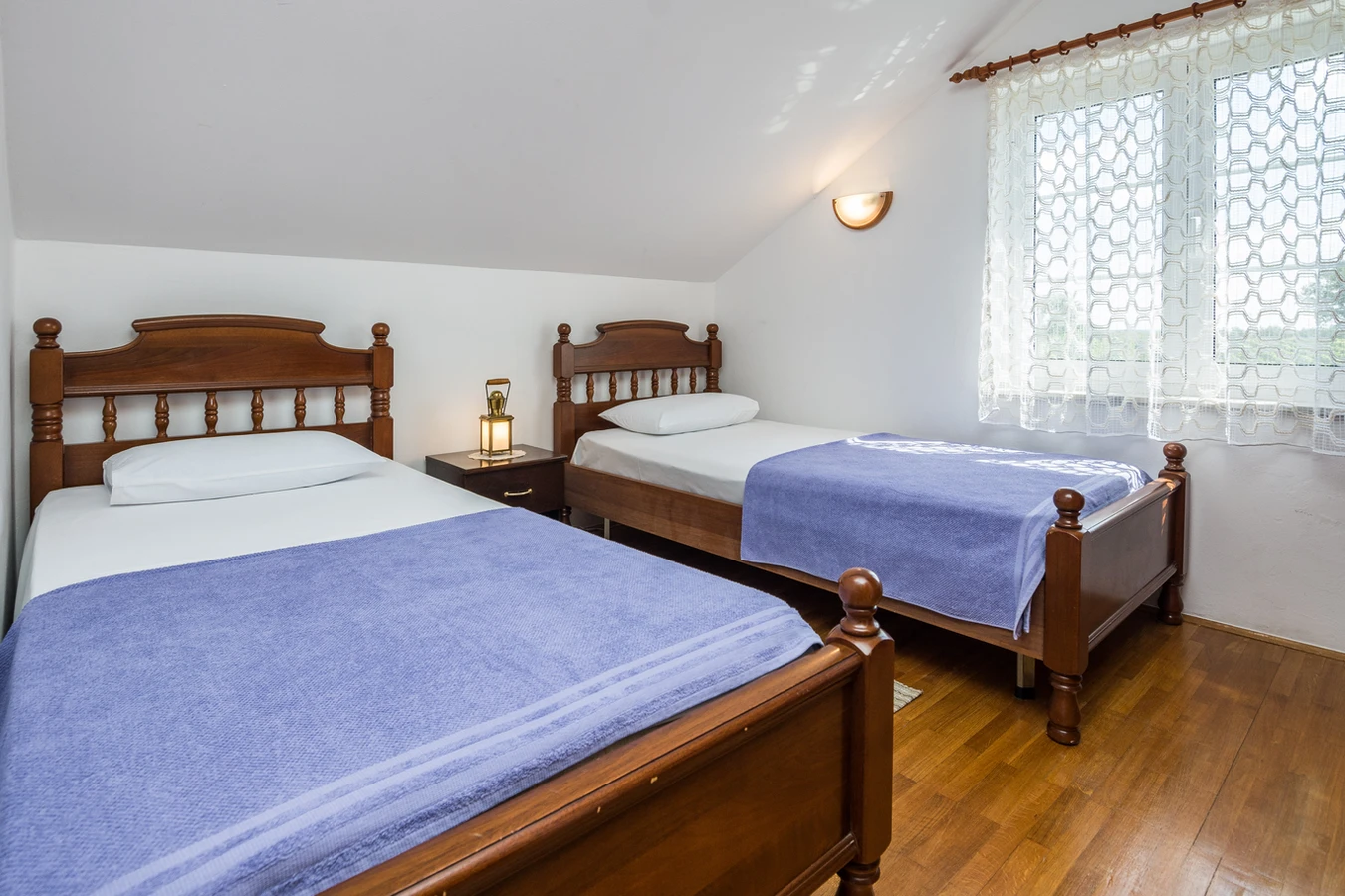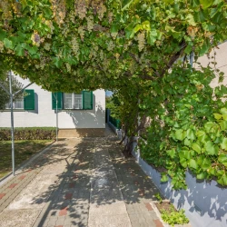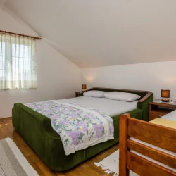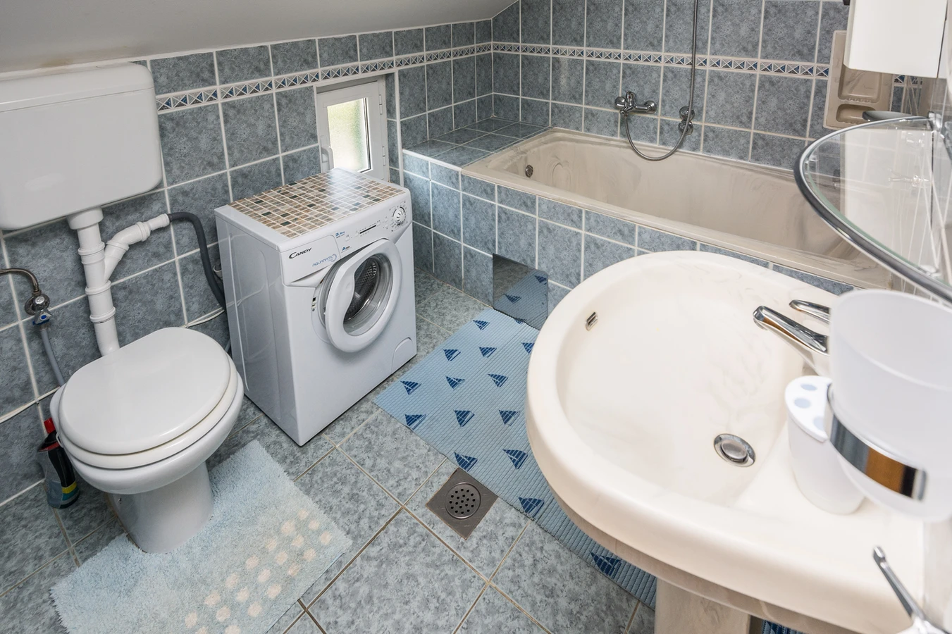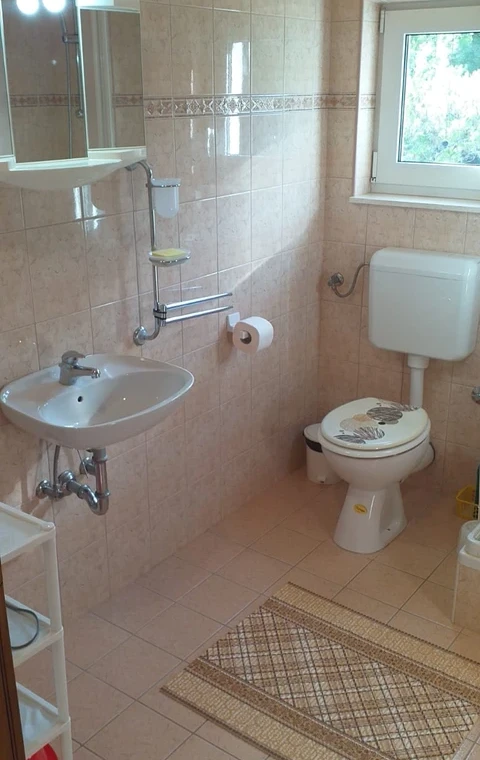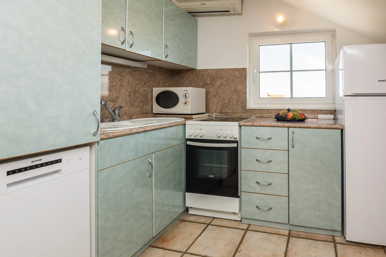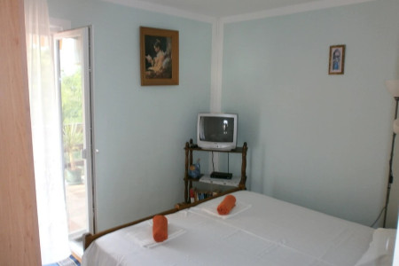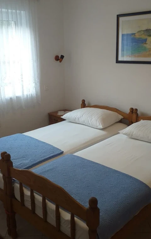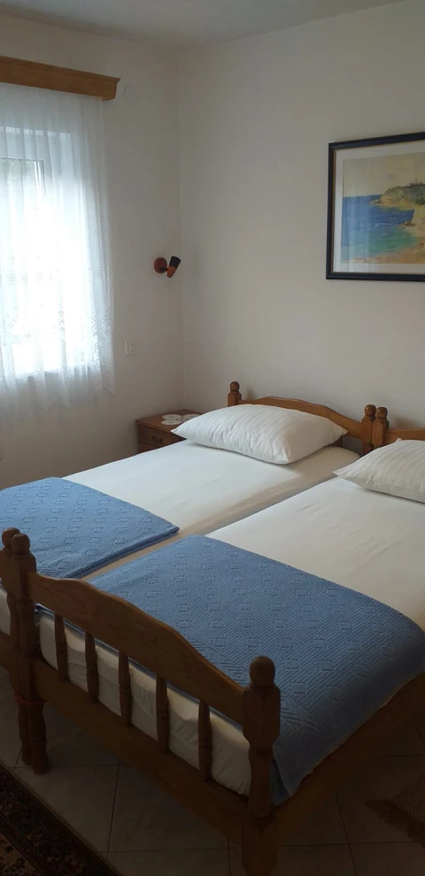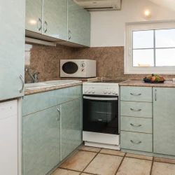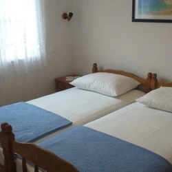 Apartment for 5 people, 55 m2, living room + kitchen, 2 bedrooms (in one there are 2 single beds, and the other is a double bed + one-time bed), bathroom, 2 parking spaces in the shade in the yard; El. stove, microwave oven, refrigerator, dishwasher, washing machine, shower with warm water in the yard, bicycle rack in the yard