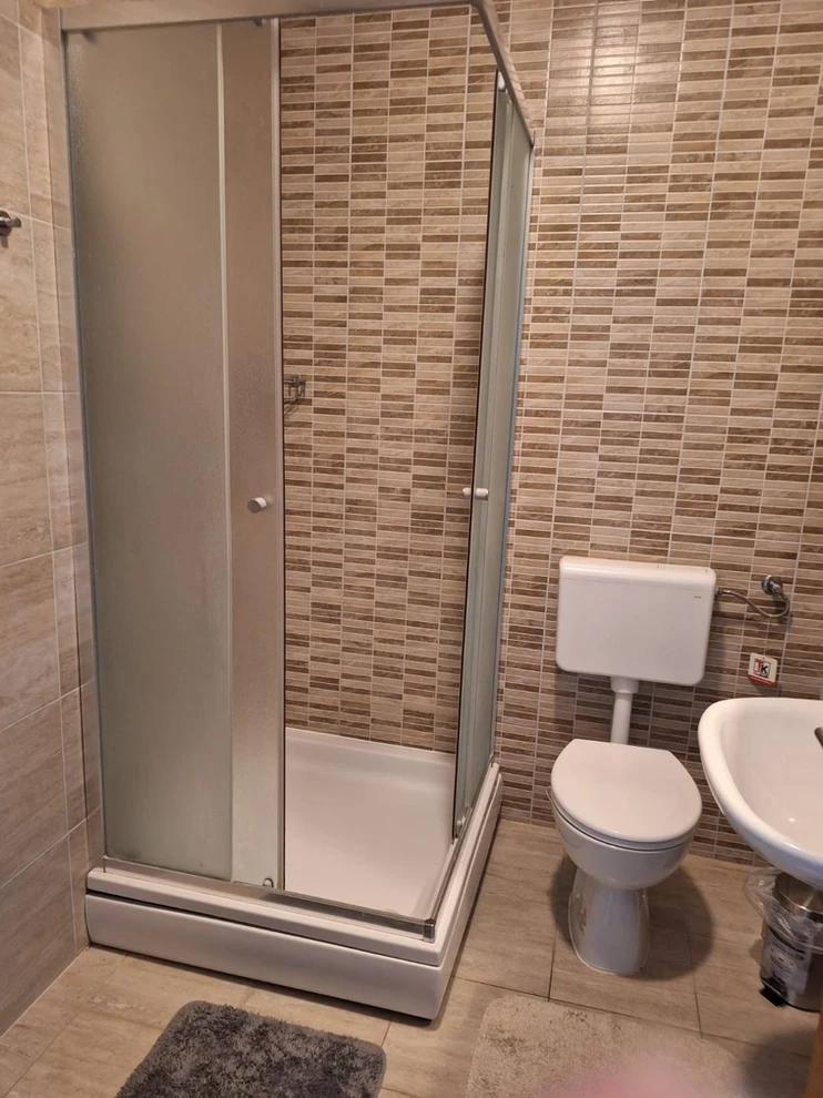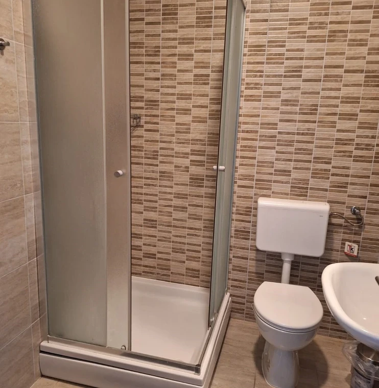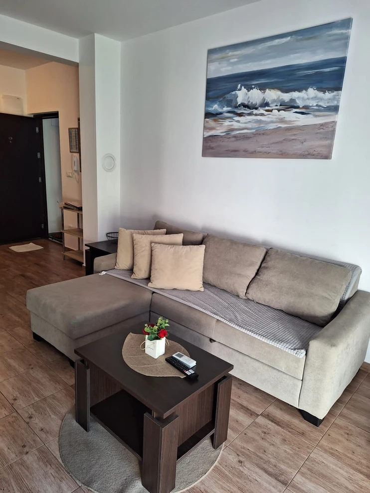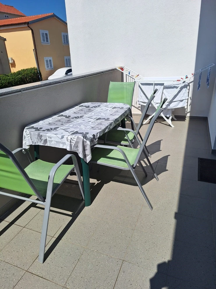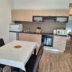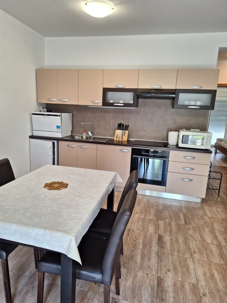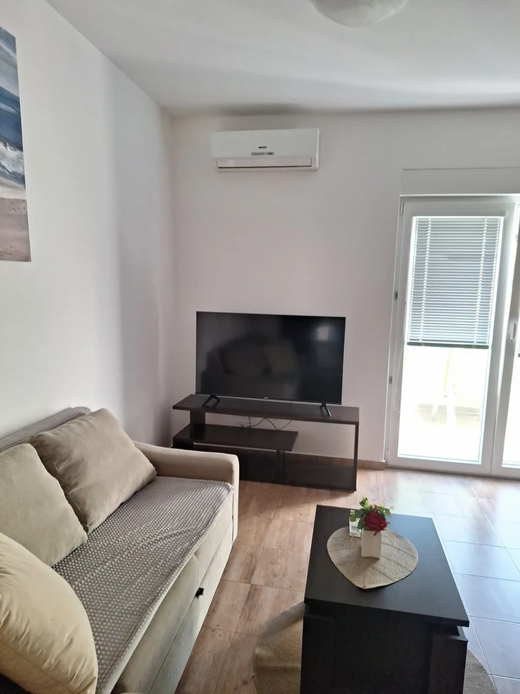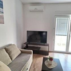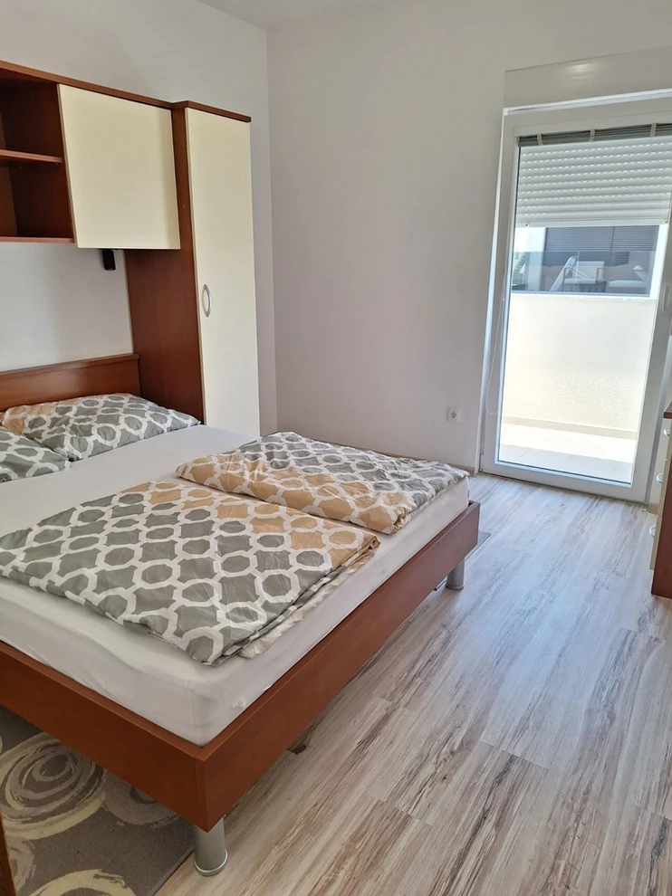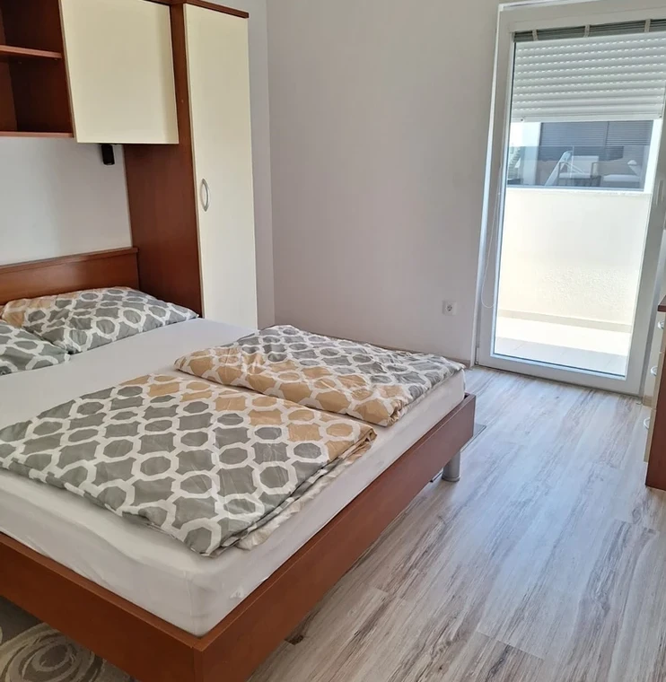 Apartment with 2 bedrooms with balcony, the concept open space is the kitchen, dining room and living room, terrace, bathroom, 4+2 people, 250m from the sea, 50m from stores and restaurants. Parking place.